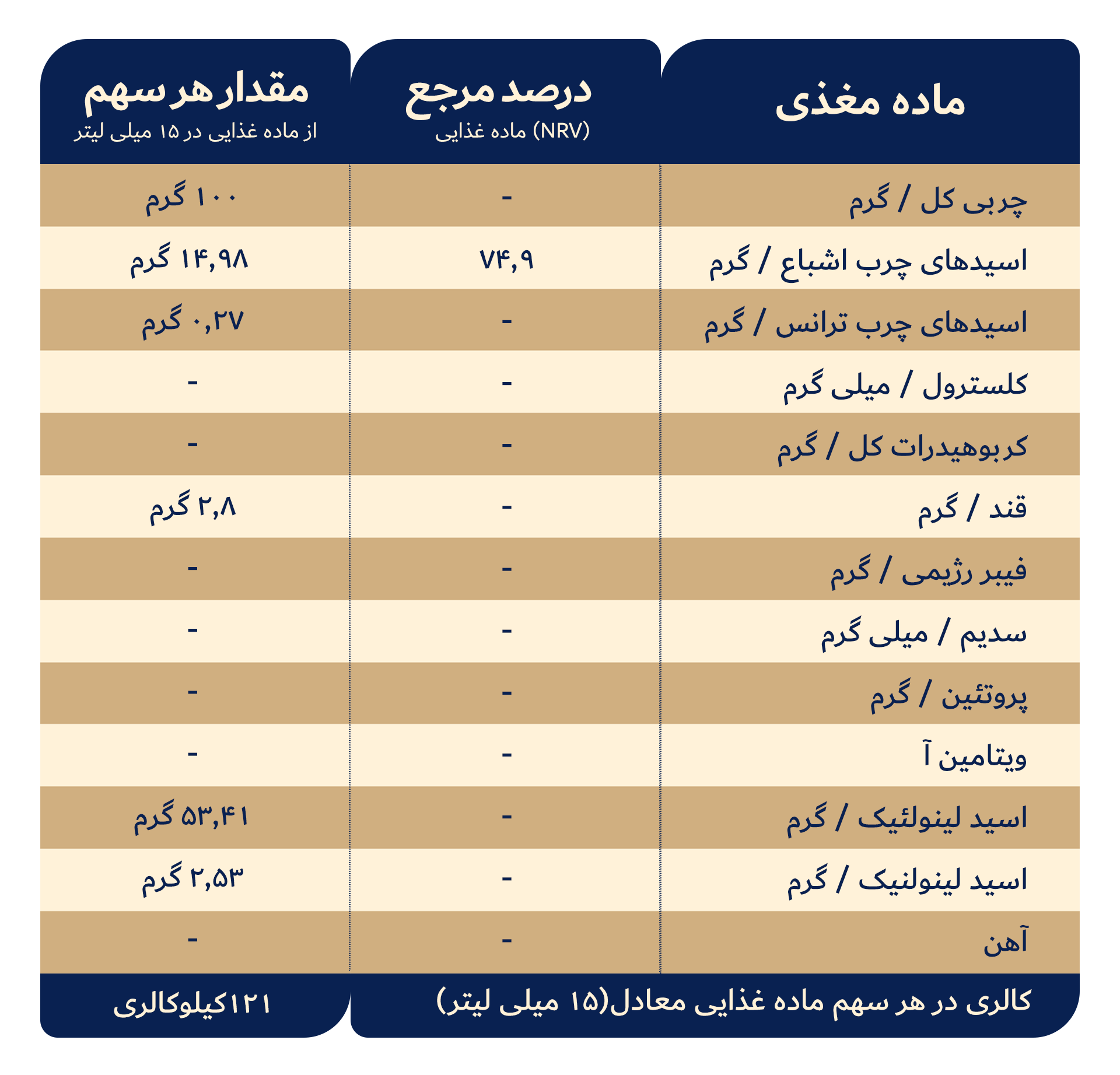 در فرمولاسیون این محصول از روغن کنجد استفاده شده و کلیه خواص تغذیهای روغن کنجد از جمله اسیدهای چرب ضروری (امگا ۶ و امگا ۹)، در این فرآورده وجود دارد. ضمن آنکه به دلیل عدم استفاده از روغن پالم، ظاهری شفاف داشته و همچنین فاقد اسیدهای چرب ترانس میباشد. پایداری مناسب این روغن سرخ کردنی در برابر اکسیداسیون، آن را برای سرخ کردنهای عمیق و طولانی مناسب نموده است. این محصول قابل استفاده برای گروههای سنی بالای 2 سال میباشد.