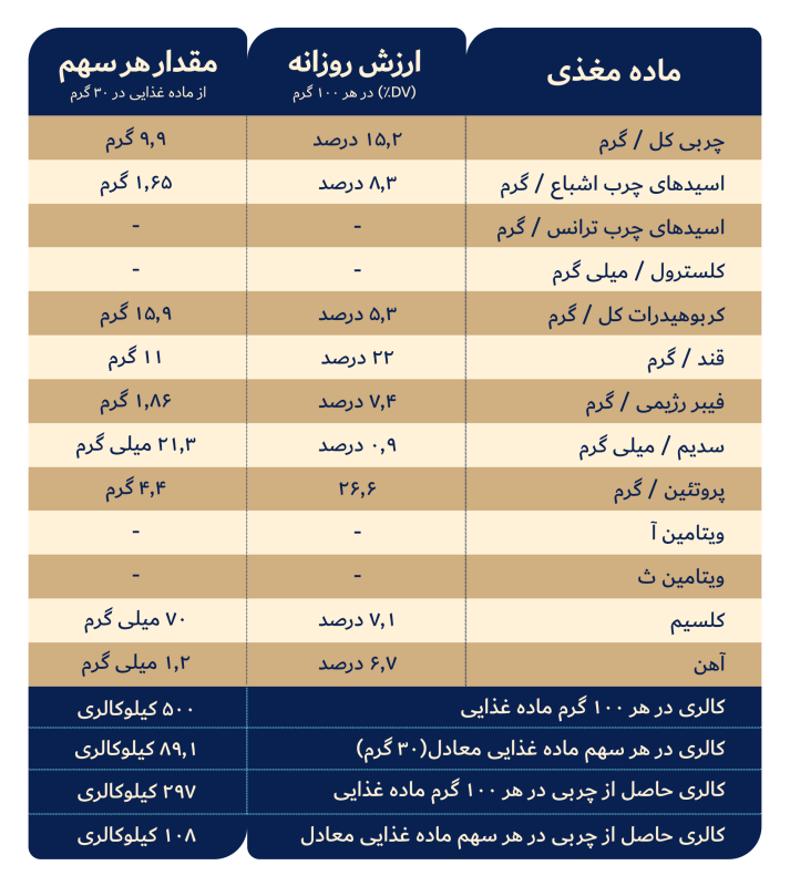فرمولاسیون این محصول بر پایه ارده (کنجد آسیاب شده) می‌باشد و به دلیل عدم استفاده از روغن هیدروژنه و پالم در تولید این فرآورده، به عنوان یک ماده غذایی مقوی، مغذی، بسيار لذيذ و سالم براي گروه‌های سنی بالای 2 سال قابل استفاده است. کرم کنجد ساده به صورت بسته بندی مناسب خانوار ( 350 گرمی)، یک نفره (25 گرمی) و فله سه کیلوگرمی تولید می‌­گردد.